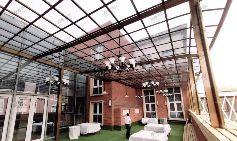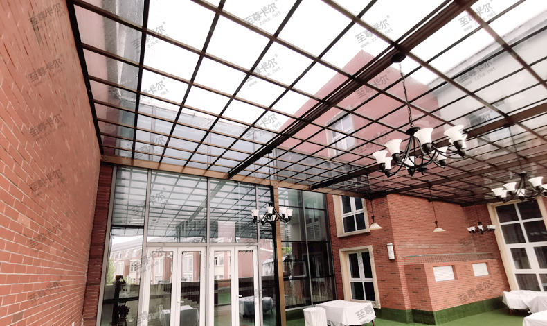 頂部用的是2.0mm聚碳酸酯板材,透光性能好(透光率88%)在陽光下曝曬不會產生黃變、霉化、透光不佳。表面有防紫外線的共擠層(uv涂成),可防止太陽紫外線引起的樹脂疲勞變黃。表面共擠層具有化學吸收紫外線并轉化為可見光。