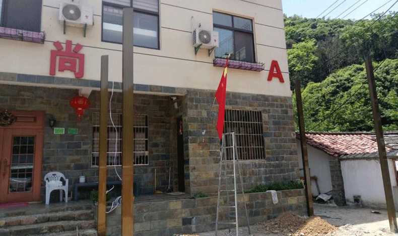 安徽省宣城市云尚山莊,一處快完工的休閑山莊,因考慮到雨天和烈日,在門口加裝遮陽雨棚。