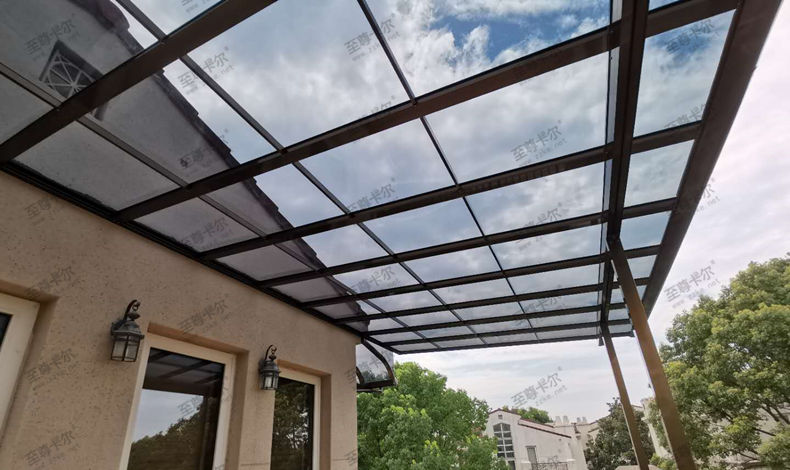 在頂棚材料上,從上圖的鋁合金雨棚圖片中可以看出來,至尊卡爾采用的是一種新型雨棚材料——聚碳酸酯板,在國內(nèi)俗稱耐力板。這種板材的優(yōu)點(diǎn)是強(qiáng)度高,可以抗12級大風(fēng)和厚度20公分的積雪的考驗(yàn)。不易滲水漏雨,更隔熱防曬,優(yōu)點(diǎn)多多。